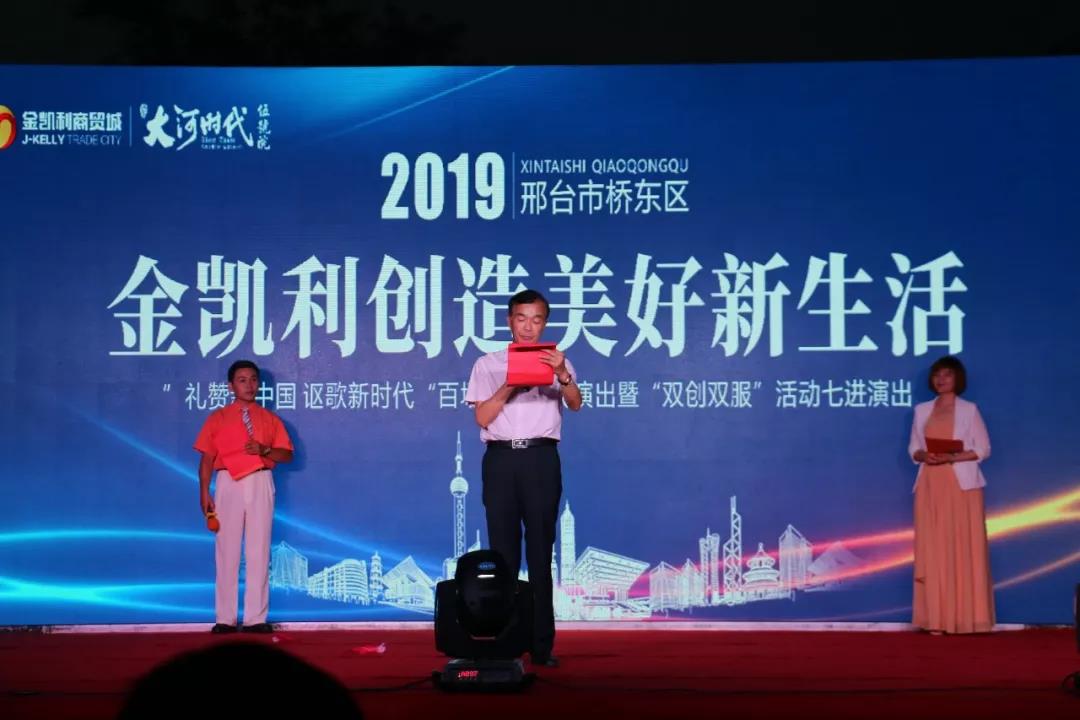 6月14日晚,由中共邢臺(tái)市橋東區(qū)政府、邢臺(tái)市文化和旅游局聯(lián)合主辦的2019年“歡樂新中國 謳歌新時(shí)代”百場文化惠民演出暨“雙創(chuàng)雙服”活動(dòng)七進(jìn)演出在金凱利廣場啟動(dòng)。邢臺(tái)橋東區(qū)委副書記申志寶、橋東區(qū)人大副主任施麗萍、橋東區(qū)政府副區(qū)長劉金紅、橋東區(qū)文化和旅游局局長左麗華、橋東區(qū)文化和旅游局副局長蘭永科、河北藍(lán)楓文化傳媒有限公司總經(jīng)理馮永敏、南長街辦事處、西門里辦事處、祝村鎮(zhèn)辦事處以及金凱利集團(tuán)總裁葛慶達(dá)、總經(jīng)理俞祖放共同出席了本次啟動(dòng)儀式。