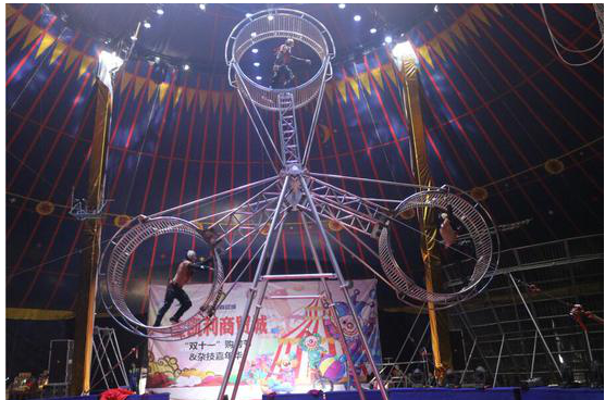 除了這些,雜技團(tuán)還表演了草帽飛舞、同時(shí)轉(zhuǎn)120個(gè)呼啦圈,還有浪橋飛人、雙人飛天等空中雜技。最后的死亡飛輪,演員們用生命挑戰(zhàn)高空+高速,動作驚險(xiǎn)萬分,更是挑戰(zhàn)觀眾心理承受極限。在幾十米空中飛旋、跳躍,沒有防護(hù),沒有鋼絲,只有對伙伴的信任和平日訓(xùn)練的經(jīng)驗(yàn)。